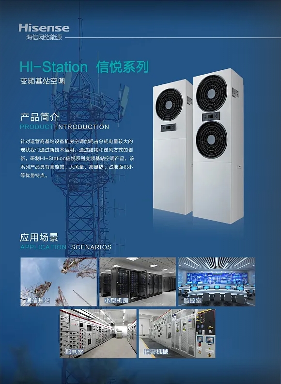 針對運營商基站設(shè)備機(jī)房空調(diào)能耗占總耗電量較大的現(xiàn)狀,海信通過新技術(shù)運用,通過結(jié)構(gòu)和送風(fēng)方式的創(chuàng)新,研制HI-Station信悅系列變頻基站空調(diào)產(chǎn)品
